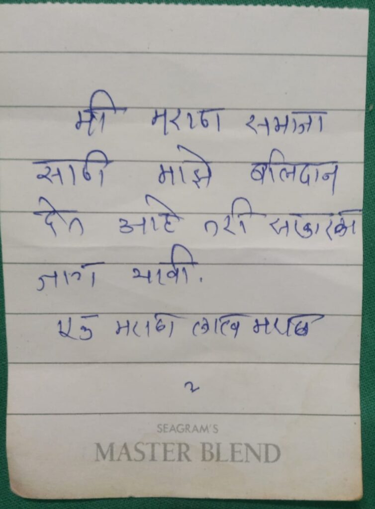 मराठा आरक्षणासाठी बलीदान देत आहे.सरकारने जागे व्हावे.आरक्षण द्या आत्महत्या करण्यापूर्वी चिठ्ठी लिहून ठेवली.